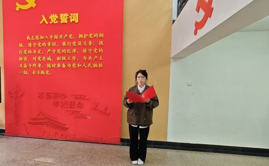 预备党员代表张可奕发言。她回顾成长历程,感恩党的悉心培育,并代表全体预备党员郑重承诺:将牢记党的教诲,以坚定信念、扎实行动,在实现民族复兴的征程中展现党员风采,传承红色基因,担当时代重任。
