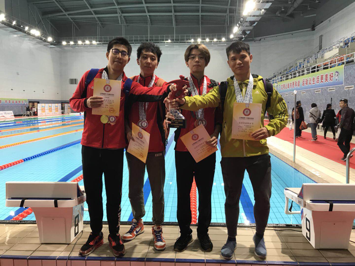游泳赛场中,机电健儿也不甘示弱。任敏毅获得男子高校部本科甲组100米蛙泳第一名、4*50米自由泳接力第二名、4*100米混合泳接力第三名、50米蛙泳第三名、50米自由泳第四名。哈琨获得男子高校部本科甲组4*50米自由泳接力第二名、4*100米混合泳接力第三名、200米蛙泳第五名。